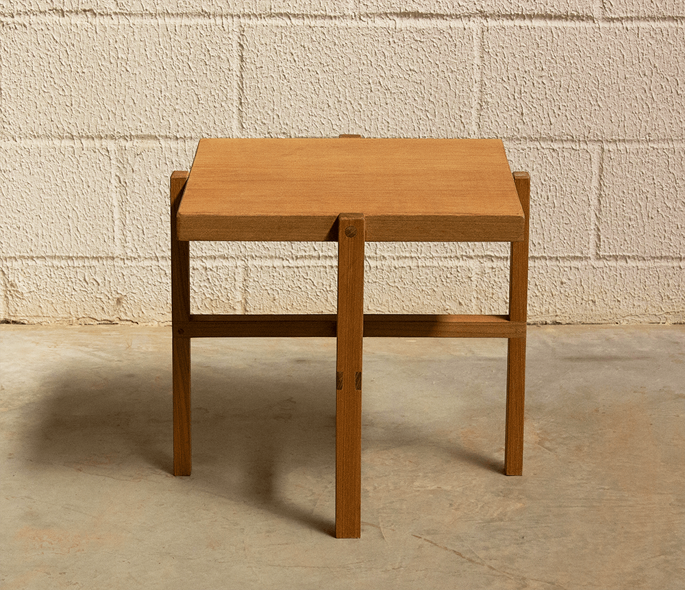 Mesa de apoio que também pode ser usada como banco, foi pensada a partir do descolamento dos pés das pontas para o centro do tampo.