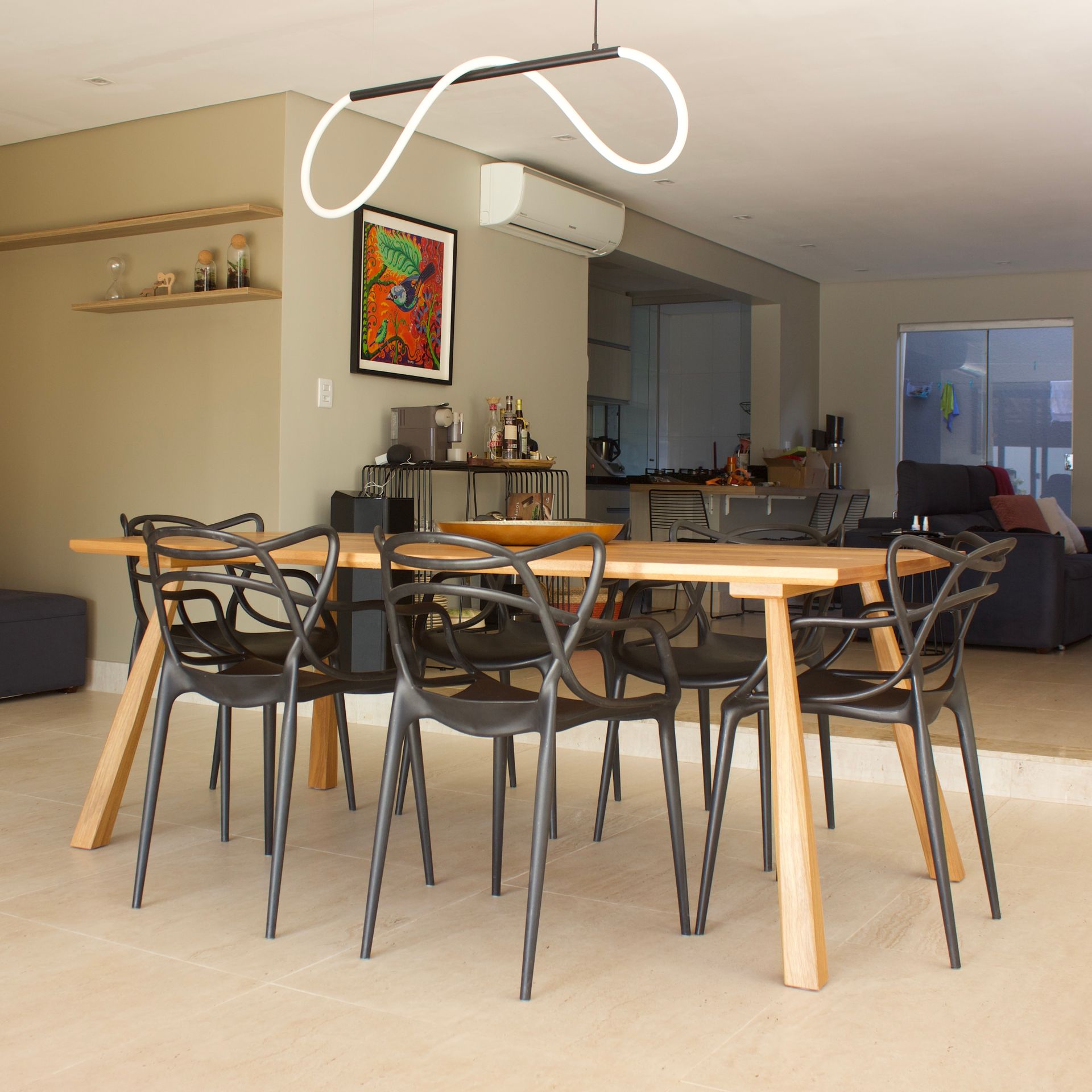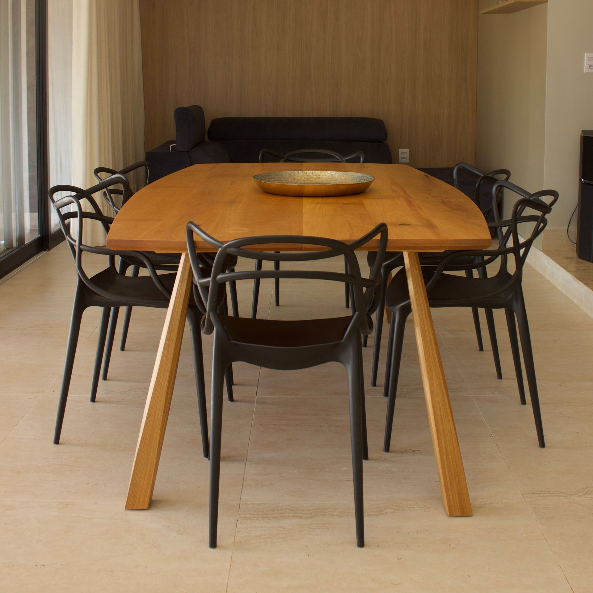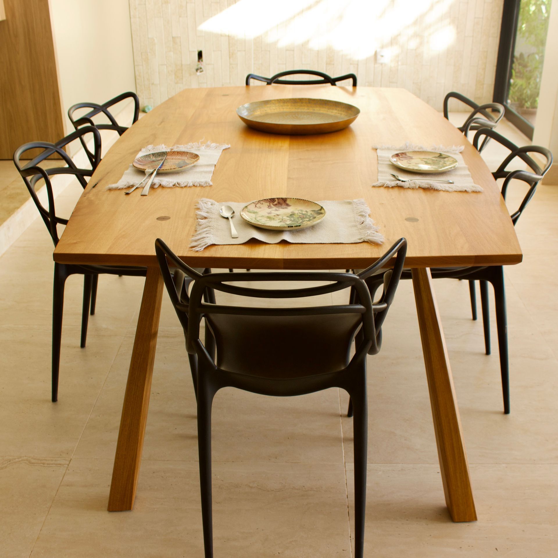Mesa de Jantar que usa técnicas tradicionais de marcenaria, com pés estaqueados.