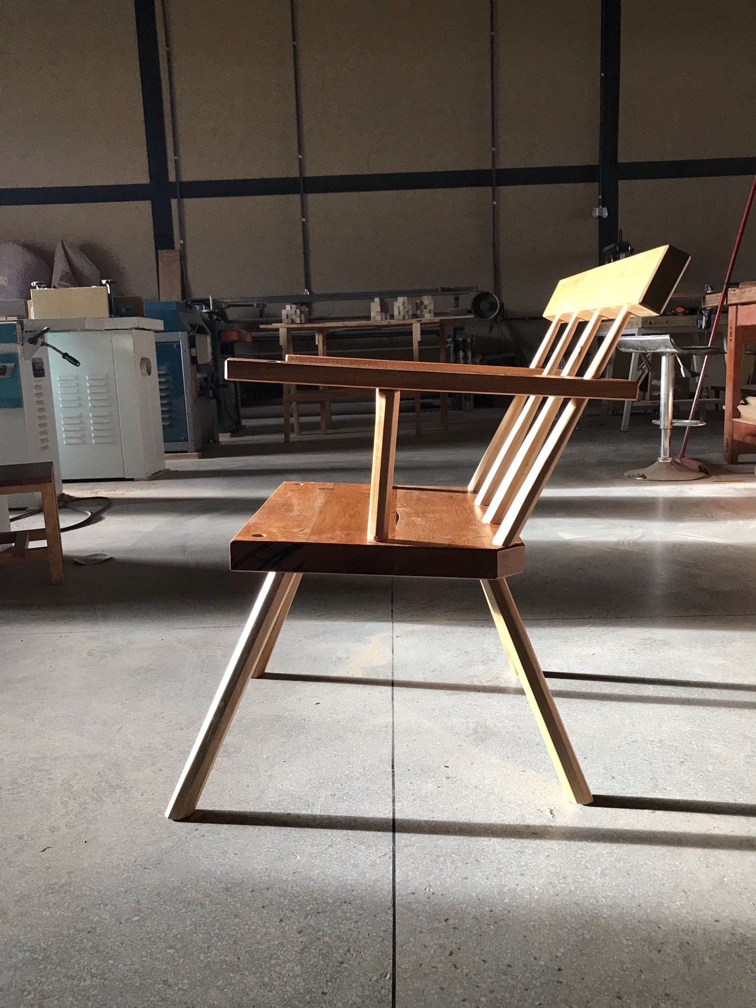 Poltroma construida utilizando construção de pés passantes. Tanto os pés como os suporte do encosto e apoio de braço se conectam e formam a poltrona no assento.